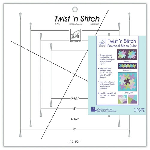 Il Righello Twist 'n Stitch crea 5 blocchi girandola di dimensioni diverse. Crea girandole perfette per blocchi, bordi e trapunte. Inizia unendo i quadrati con i bordi, quindi allinea il righello sulle sezioni trasversali da tagliare. Taglia cinque blocchi girandola di diverse dimensioni da 3” a 10” finiti.