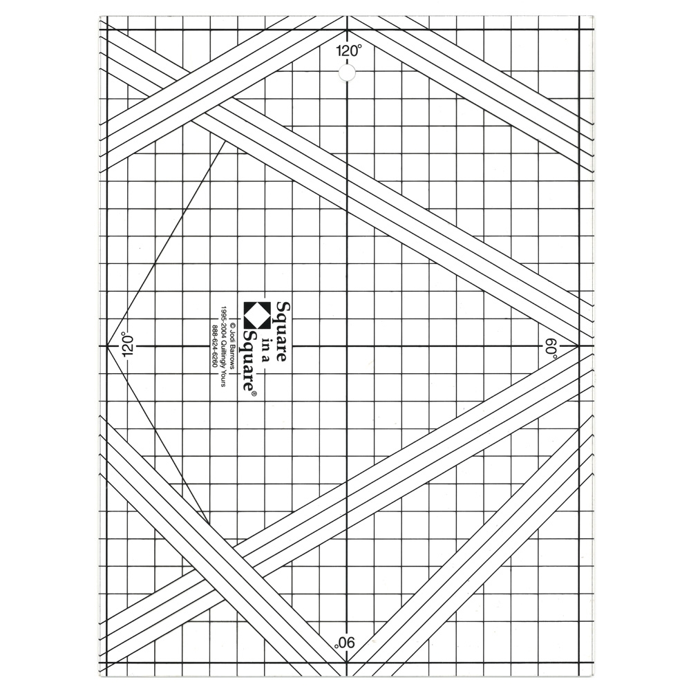 Il Righello per girandola Twst'n Stitch è molto utile per il lavoro patchwork, per la realizzazione del blocco a girandola. Consente di creare punti perfetti sui blocchi trapunta. Cuci strisce di tessuto su quadrati di tessuto, quindi usa le linee sul righello per tagliare il quadrato centrale per ottenere un quadrato perfetto in un quadrato.